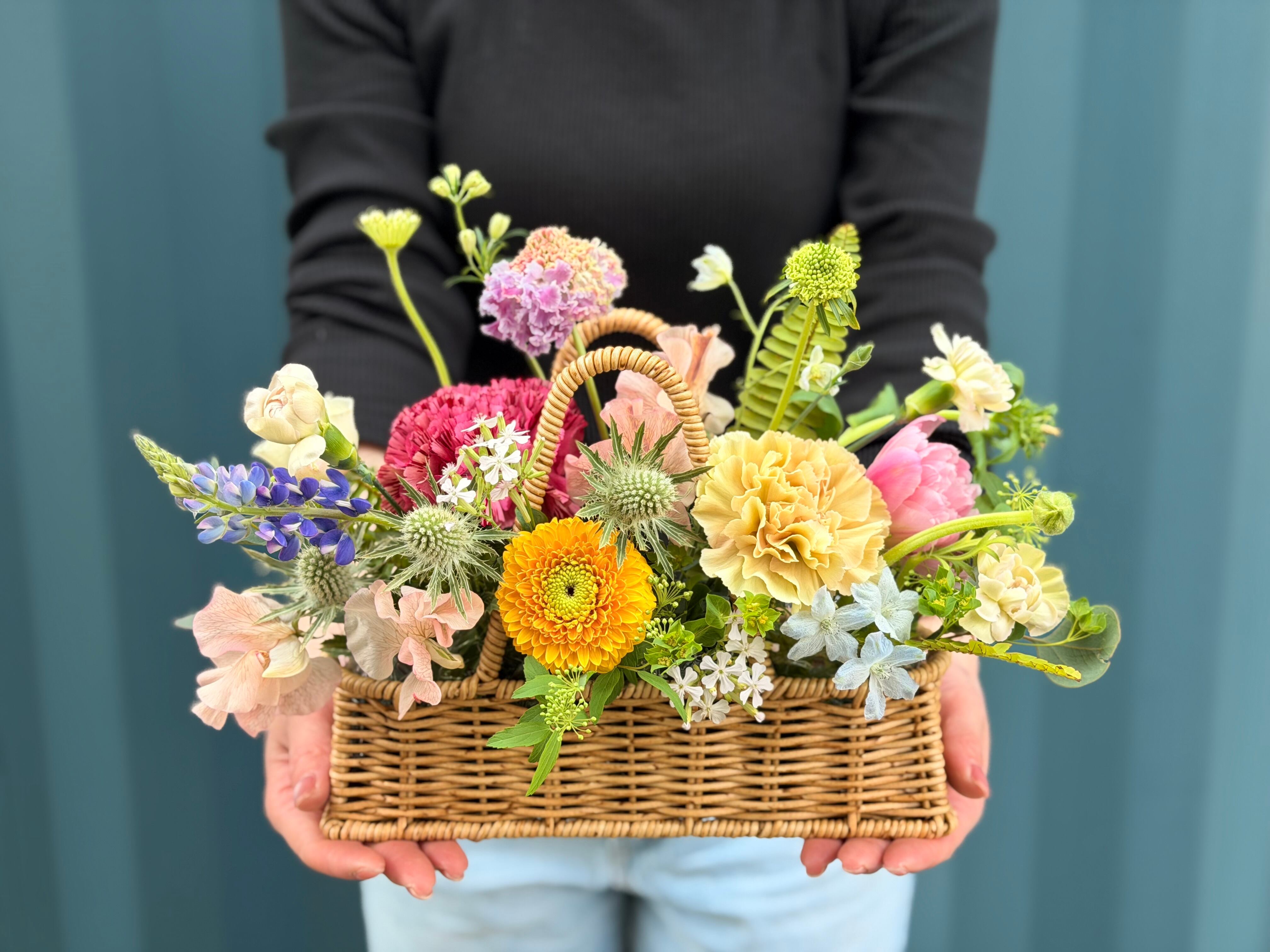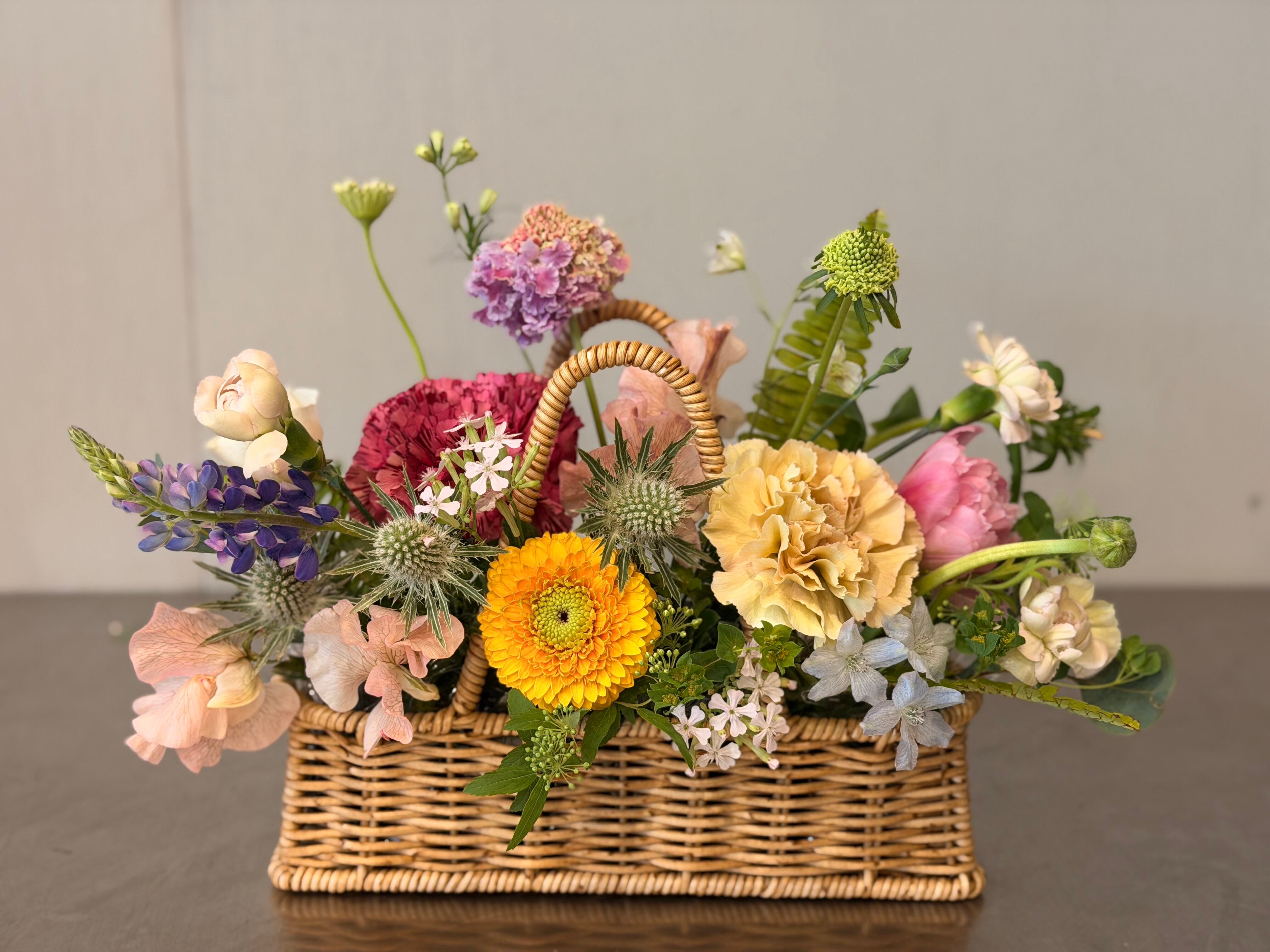 この商品は、カゴにたっぷりの花々を詰め込んだ贅沢なデザインが特徴です。色とりどりの花たちが、見ているだけで心を和ませる魅力を持っています。リビングや玄関に飾れば、温かい雰囲気を醸し出し、特別な日を彩ります。